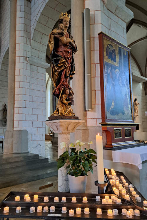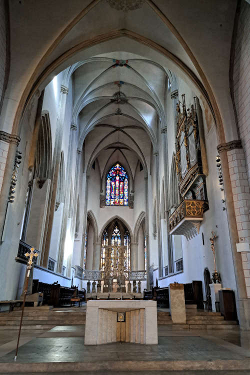 De Hohe Dom St. Maria is een plek waar de tijd lijkt stil te staan. De kathedraal is een architectonisch rariteitenkabinet in de beste zin van het woord. Het heeft zowel romaanse als gotische elementen die naadloos in elkaar overvloeien. Absolute hoogtepunten in de kerk zijn de vijf profetenramen in het hoogschip. Deze glas-in-loodramen dateren uit de late 11e eeuw en behoren tot de oudste figuratieve glaschilderingen ter wereld. De afgebeelde profeten kijken met hun strenge, Byzantijnse blikken al bijna duizend jaar neer op de gelovigen. Ook de bronzen deuren met 35 gedetailleerde reliëfplaten en de crypte onder het koor ademen een sfeer van diepe devotie en onvergankelijkheid uit.