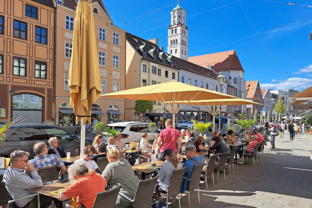 Voor de beste sfeer strijk je neer op de Rathausplatz of langs de statige Maximilianstraße. Zoek je iets knusser? De terrasjes in het Lechviertel, direct aan de kleine kanalen, zijn zeer sfeervol.
