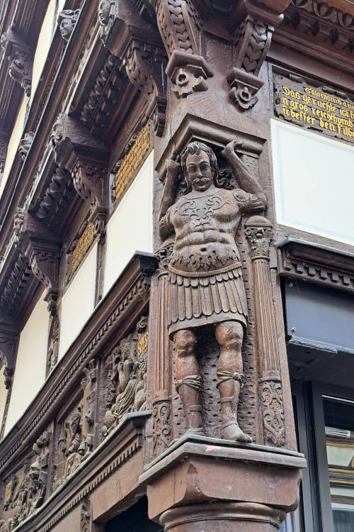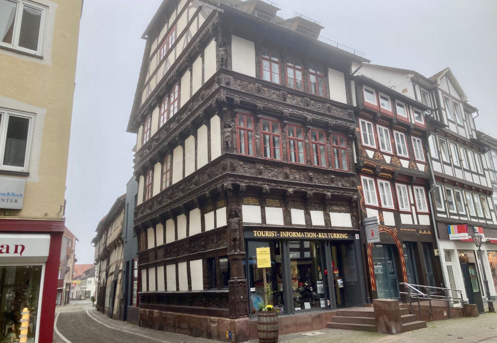 Vooral het Eickesches Haus aan de Marktstraat is adembenemend. Het is misschien wel het mooiste vakwerkhuis van Duitsland. Het pand dateert uit 1612 en is een echt meesterwerk. De gevel is zo rijkelijk en minutieus bewerkt dat je er uren naar kunt kijken. Elena wijst op de details. Zo zien we prachtig houtsnijwerk. Elk figuur vertelt een verhaal uit de Bijbel of uit de klassieke oudheid. Dit huis was een visitekaartje van de familie Eicke, een bewijs van hun welvaart. Nu is er de VVV van Einbeck gevestigd.