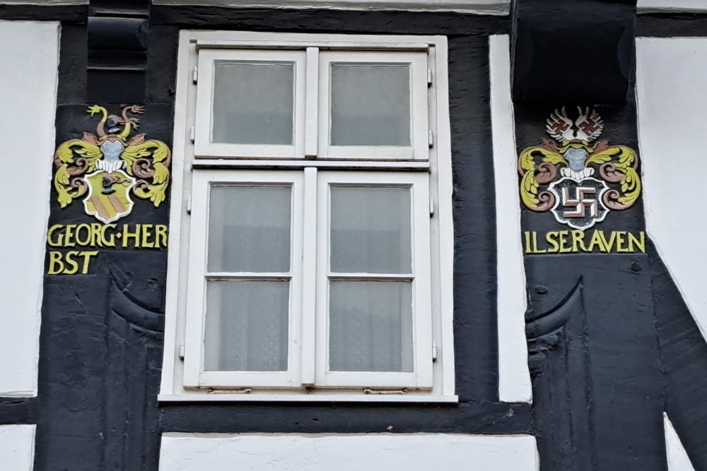 In Einbeck was het bovendien het familiewapen van de rijke Patriciërsfamilie Raven. Deze familie behoorde tot de top van de burgerij. Dit geslacht bestuurde de stad en was ongelooflijk rijk door de handel. Ze lieten hun familiewapen trots aanbrengen op de meest opvallende plekken van hun huizen. Zo gaven ze uiting aan hun belangrijke status. We staan erbij stil hoe wrang de geschiedenis kan lopen. De familie Raven zou zich ongetwijfeld in hun graf omdraaien als ze wisten hoe hun wapen in de 20e eeuw werd gekaapt. En hoe het vervolgens werd misbruikt als luguber teken van een verwoestende ideologie.
