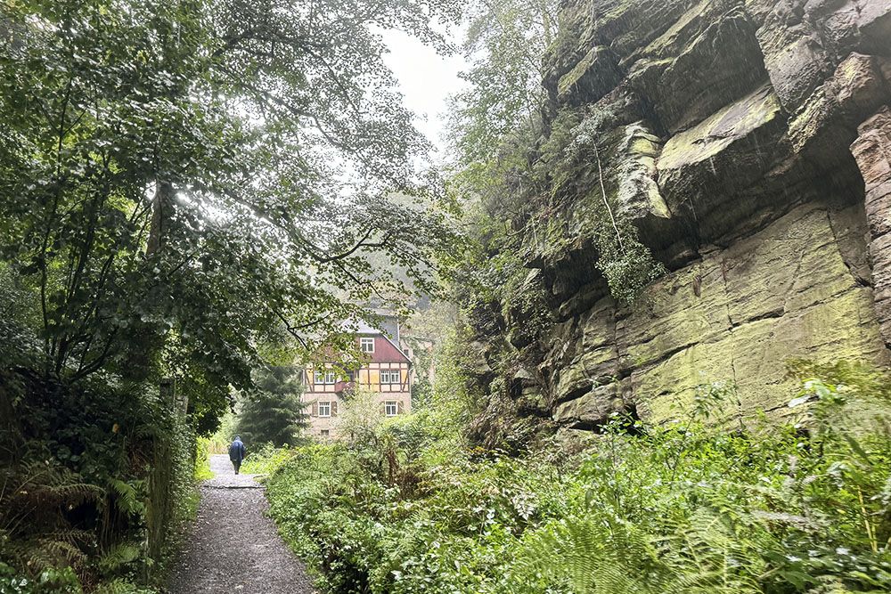 Het pad leidt ons vervolgens over smalle richels en door nauwe rotskloven. We klauteren voorzichtig over de gladde stenen, waarbij we elkaar waar nodig een helpende hand bieden. Het is mede dankzij dit avontuurlijke karakter van de route dat we ons nauwelijks meer bewust zijn van de aanhoudende regen. En met die instelling bereiken we uiteindelijk Hohnstein, onze eindbestemming van vandaag.