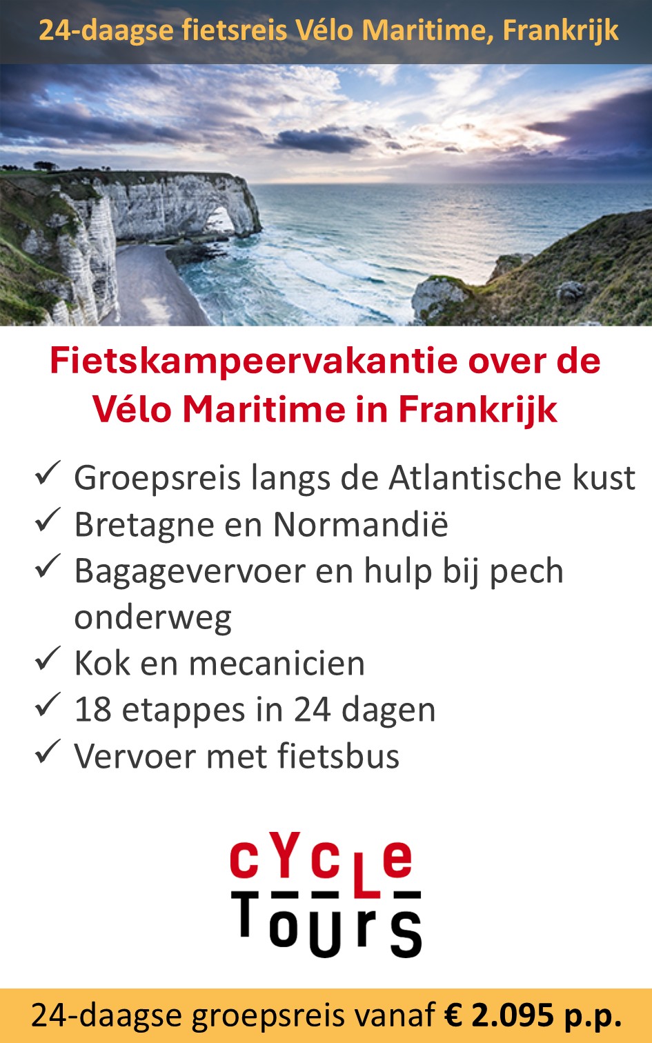 De Vélomaritime (EuroVelo 4) is een 1500 kilometer lange fietsroute langs de kustlijn van Hauts-de-France, Normandië en Bretagne. De route begint officieel in Roscoff in Bretagne. Vanaf daar voert de Vélomaritime langs prachtige kustlandschappen tot de Frans-Belgische grens bij Duinkerke. Je passeert daarbij fraaie zandstranden, steile kliffen en idyllische baaien. Maar ook schilderachtige stadjes, pittoreske dorpjes en vele historische bezienswaardigheden.