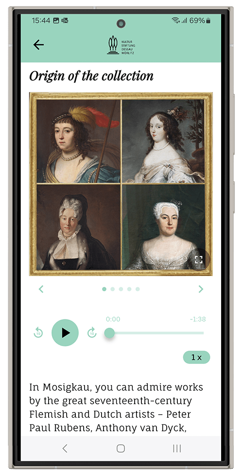 Hoewel Slotpark Mosigkau pas in 2026 beschikbaar zal zijn in de Gartenreich-app, biedt die nu al informatie over de hoogwaardige schilderijencollectie van Oranje-oorsprong. Er is inleidende informatie over de oprichter, prinses Anna Wilhelmina van Anhalt-Dessau. Ook de geschiedenis van het paleis en de collectie, de centrale schilderijengalerij en de aangrenzende kamers worden belicht. Dit deel van de app concentreert zich op de Nederlandse en Vlaamse schilderijen, anekdotes uit het leven van individuele kunstenaars, afgebeelde personen en achtergrondinformatie over iconografie.