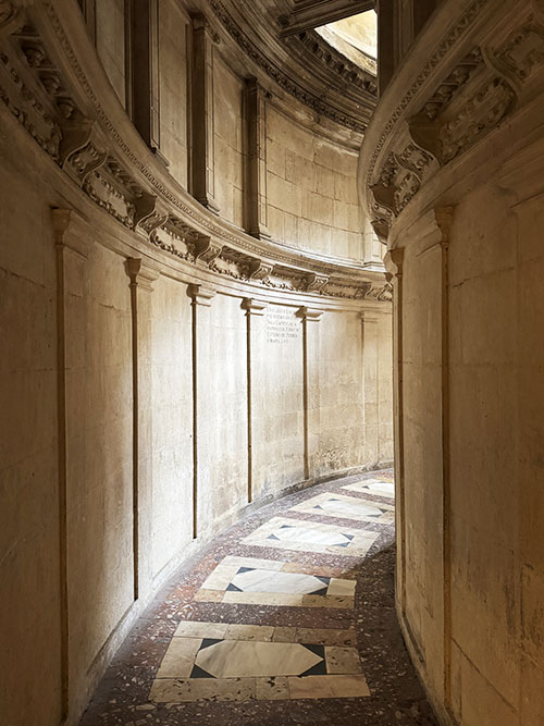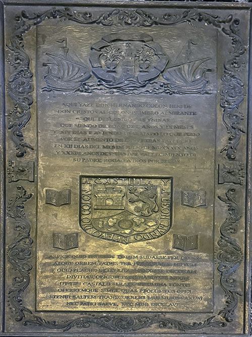 Niet ver daarvandaan blijft Dori even staan bij een grote marmeren grafsteen in de vloer. Het wapen, de ornamenten en de Latijnse tekst trekken meteen de aandacht. “Hier ligt Fernando Columbus”, zegt ze. “De tweede zoon van de ontdekkingsreiziger.”