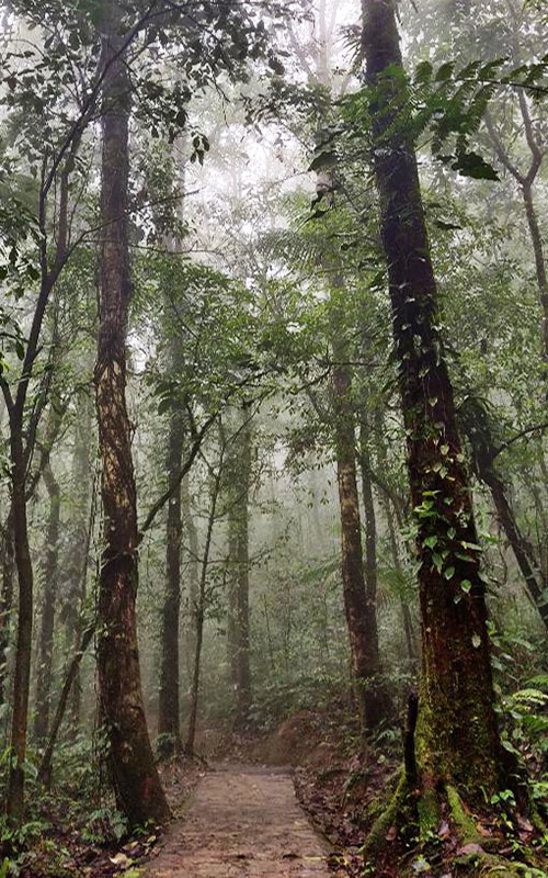 De wandelpaden slingeren door dichte vegetatie. Ze leiden ons langs fraaie uitzichtpunten. We lopen over hangbruggen hoog boven de boomtoppen. De wind beweegt de wolken om ons heen. Het voelt alsof we boven het bos zweven.