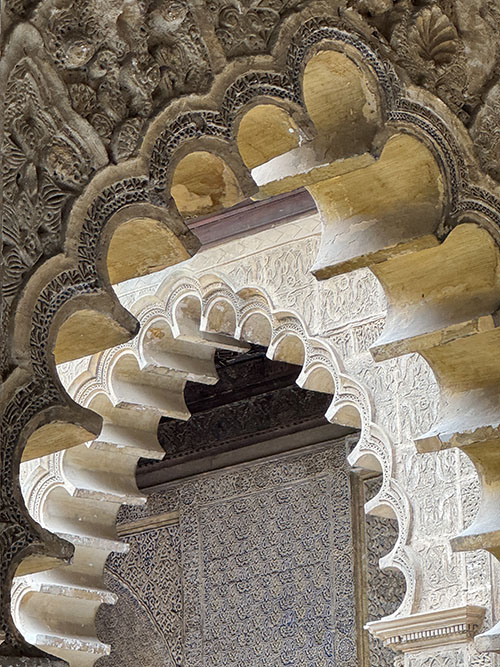 Dori wijst op de muren en de tegels. Op de ritmische patronen die overal terugkomen. “Dit is de Mudejarstijl”, zegt ze. “Christelijke architectuur met islamitische vormen en vakmanschap.” Veel van deze zalen zijn gebouwd door Moorse ambachtslieden uit Granada en Toledo. Sommigen werkten ook aan het Alhambra. Koning Pedro I bewonderde die stijl zo sterk dat hij hen vroeg iets vergelijkbaars in Sevilla te maken. Daarom oogt dit paleis soms bijna als een Andalusische tegenhanger van Granada’s beroemdste monument. Alles sluit naadloos op elkaar aan.