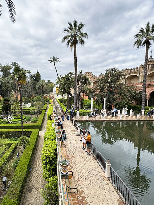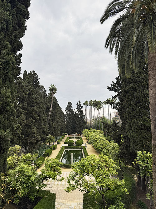 We bezoeken daarna nog meer zalen, de een nog rijker dan de ander. Zoals de Patio de las Muñecas met zijn verfijnde bogen en de hoge gotische zalen die later werden toegevoegd. Maar ook de vertrekken van Karel V met hun sobere, bijna strakke lijnen. En de baden van Doña María de Padilla uit de 14e eeuw die half ondergronds liggen. Het is een aaneenschakeling van stijlen en verhalen. Op een gegeven moment duizelt het bijna door alle indrukken. Dan is het tijd voor iets anders. De tuinen wachten. Een welkome afwisseling na zoveel pracht binnen.