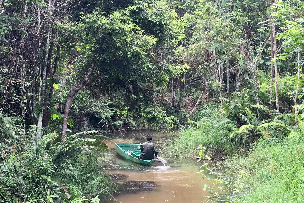 “Hier komen we bij de orang-oetan eilanden”, zegt August terwijl hij naar door water omheinde gebieden wijst. Het zijn geen echte eilanden, maar stukken land waar orang-oetans veilig kunnen leven. Samboja Lodge is onderdeel van de Borneo Orangutan Survival (BOS) Foundation, opgericht in 1991. “We hebben hier 112 orang-oetans onder onze zorg”, vertelt hij. De stichting redt deze mensapen uit situaties van habitatverlies en conflicten. Veel dieren zijn gered uit de illegale huisdierenhandel of ontboste gebieden.