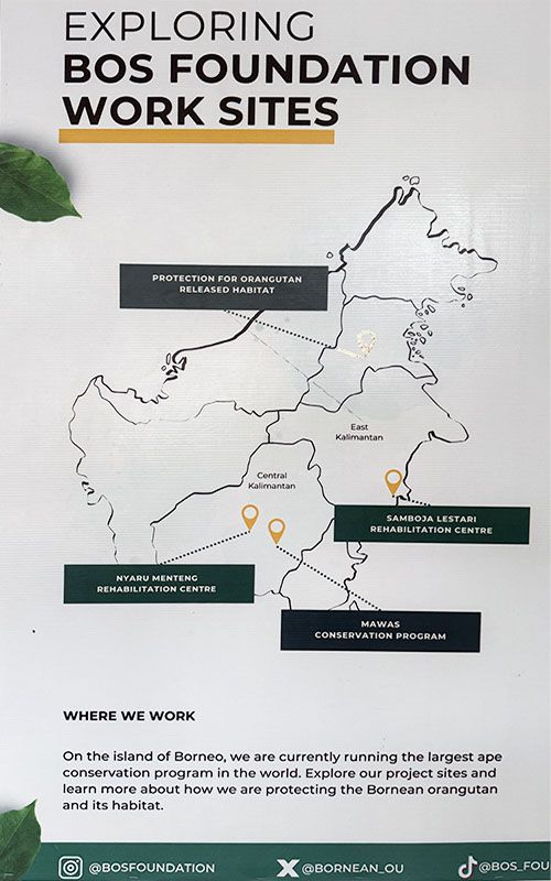 August leidt ons naar het BOS Foundation-kantoor, verscholen tussen bomen. “Hier klopt het hart van onze operatie”, zegt hij. Binnen hangen informatiepanelen met het verhaal van Samboja Lestari.