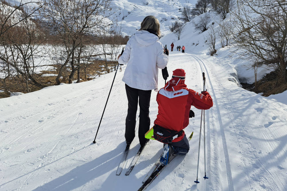 De zon schijnt weer volop en de omstandigheden zijn perfect. Toch merken we al snel dat langlaufen best enorm inspannend is, zeker met onze nog gebrekkige techniek. Op de vlakke stukken gaat het redelijk. Het vinden van het ritme is de grootste uitdaging. Maar vooral afdalen is lastig en zorgt voor de nodige valpartijen.
