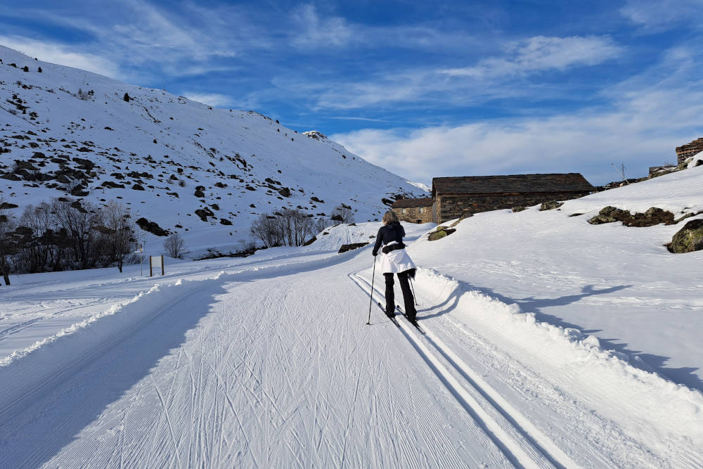 De volgende dag staat er weer een nieuwe uitdaging op het programma. Gaetan pikt ons opnieuw op, dit keer met lange smalle latten: we gaan langlaufen! Deze sport combineert de elegantie van schaatsen met de inspanning van hardlopen. Onze bestemming is Plan de l’Eau, een prachtig en rustig langlaufgebied met geprepareerde loipes.
