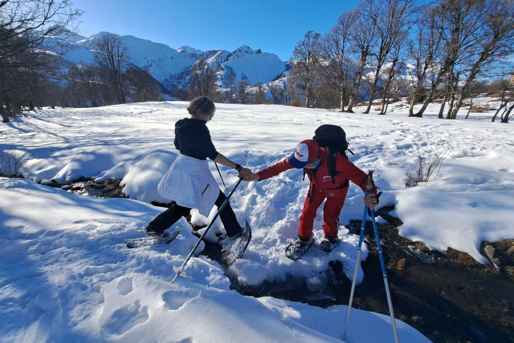 Ons avontuur begint met een sneeuwschoenwandeling. Gaetan is onze begeleider, een enthousiaste gids van de skischool École du Ski Français (ESF). Gaetan heeft de berg als zijn achtertuin en weet precies de mooiste plekken te vinden.