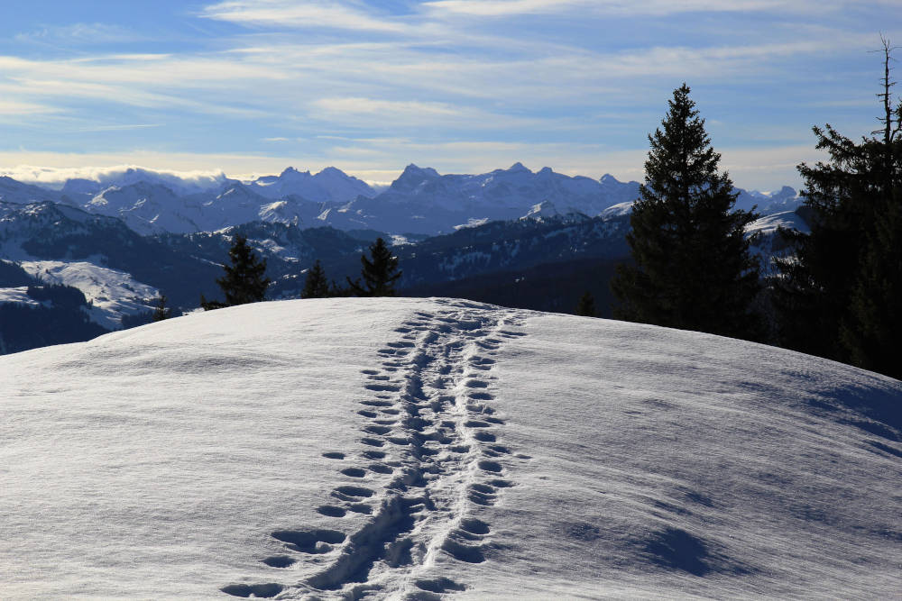 “Kijk in de verte!”, roept Gaetan iedere keer als we te veel naar onze voeten kijken. Dat helpt wel, maar toch gaan we af en toe onderuit. Gelukkig is de sneeuw zacht en de omgeving prachtig. Dat maakt de valpartijen draaglijk.