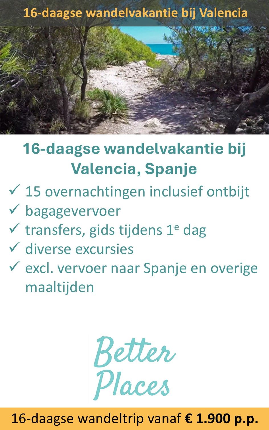 Wist je dat de regio Valencia ontzettend mooi is? Combineer een paar dagen in de stad met een route door het achterland, met natuurparken, kustpaden en authentieke dorpjes waar je het échte Spanje ervaart. Bij reisorganisatie Better Places vind je inspiratie voor een roadtrip Valencia of een actieve wandel- of fietsvakantie. |
