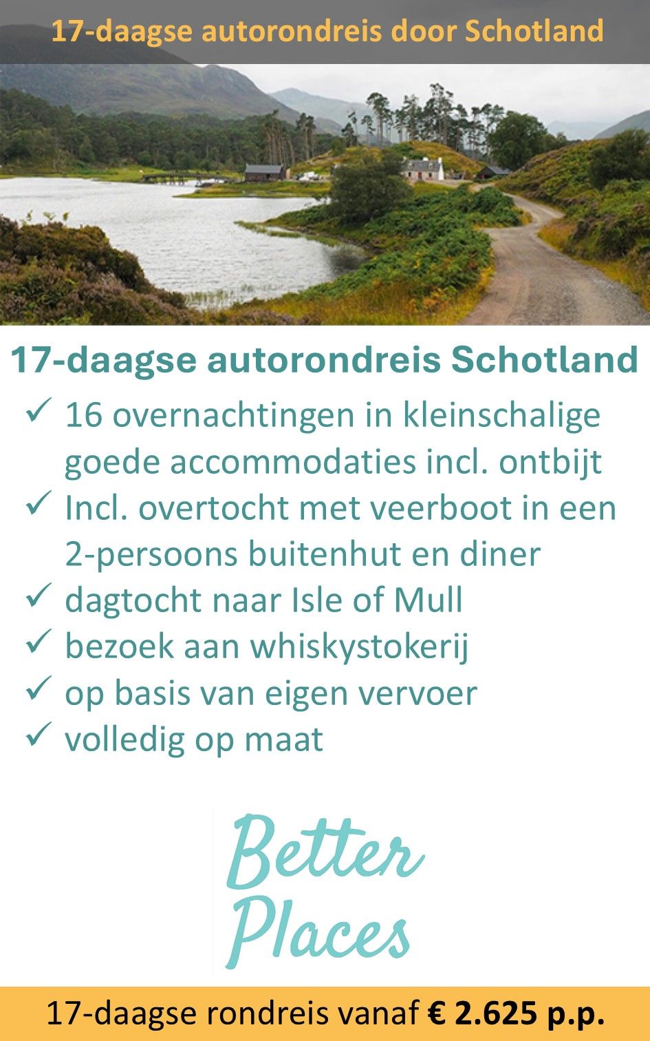 Schotland is een fantastisch land voor een roadtrip of een wandelvakantie. Bij reisorganisatie Better Places kun je je ideale rondreis helemaal naar eigen wens laten samenstellen. Je kunt natuurlijk ook een van de voorbeeldreizen van Better Places gebruiken. |
