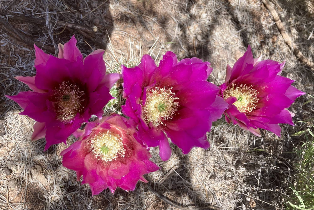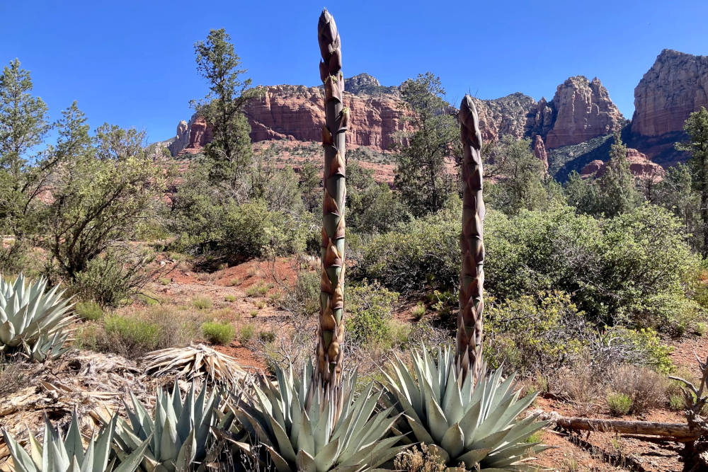 Max rijdt ons naar een kleine, verlaten parkeerplaats. Hij legt uit dat hij de drukke toeristenpunten liever vermijdt. Zo ervaren we de natuur op de beste manier zonder honderden andere wandelaars. We stappen uit in het Coconino National Forest. Dit is een enorm natuurgebied van bijna twee miljoen hectare groot. De variatie in planten is groot. We zien de bekende agave en verschillende soorten cactussen met vlijmscherpe stekels. Sommige staan fraai in bloei. Ook staan er jeneverbessen met hun kronkelige takken en grote pijnbomen die een heerlijke geur verspreiden in de warmte.