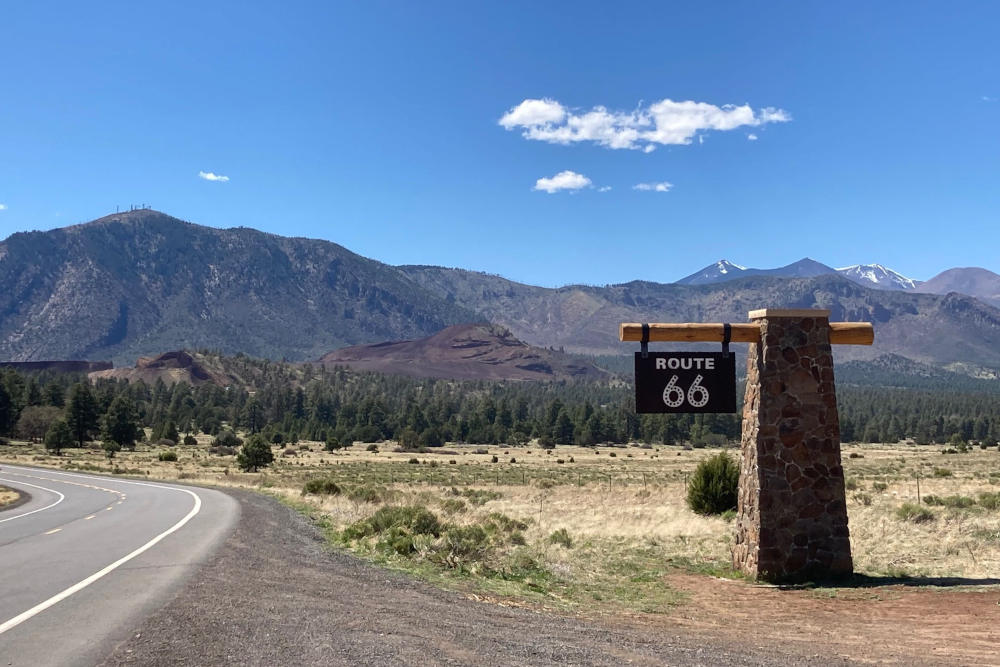 Vlakbij de stad Flagstaff kunnen we het niet laten. We sturen onze auto een stukje over de iconische Route 66. Deze weg was vroeger de belangrijkste verbinding tussen Chicago en Los Angeles. De route ademt de sfeer van oude Amerikaanse auto’s en neonreclames. Hoewel grote snelwegen de rol van deze weg hebben overgenomen, blijft het bijzonder om hier te rijden. Het is een kort ritje, maar de nostalgie van de historische weg pakken we mooi even mee.