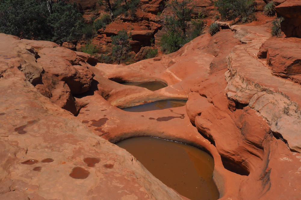 Na een tijdje wandelen komen we uit bij de Soldiers Pass. Dit is een heel bekende plek en dat merken we meteen aan de drukte. Dit gebied is populair omdat er veel te zien is op een klein oppervlak. We passeren een enorme sinkhole in de grond, de Devil’s Kitchen, die ontstaan is door het instorten van ondergrondse grotten. Daarna lopen we langs de Seven Sacred Pools. Dit zijn zeven natuurlijke gaten in de rotsen die trapsgewijs boven elkaar liggen. In dit droge gebied zijn deze poelen van levensbelang voor de dieren. Als het regent, stroomt het water als een waterval van het ene gat in het andere.